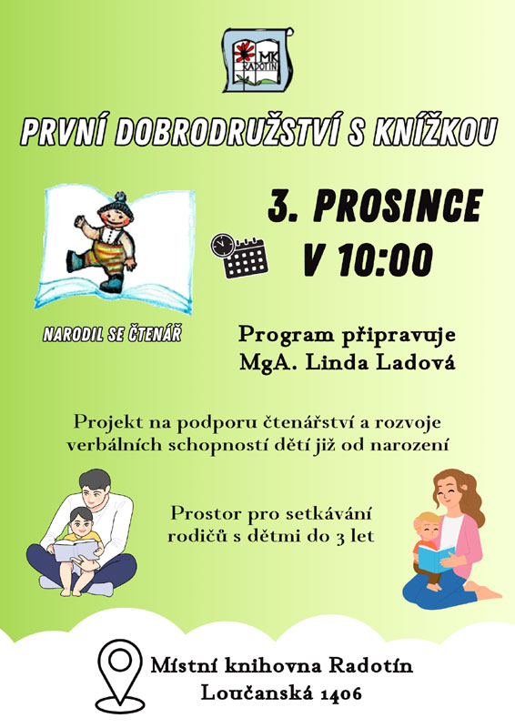 Projekt na podporu čtenářství a rozvoje verbálních schopností dětí již od narození a prostor pro setkávání rodičů s dětmi do 3 let. Akce se koná v knihovně pravidelně každou první středu v měsíci od 10 hodin.